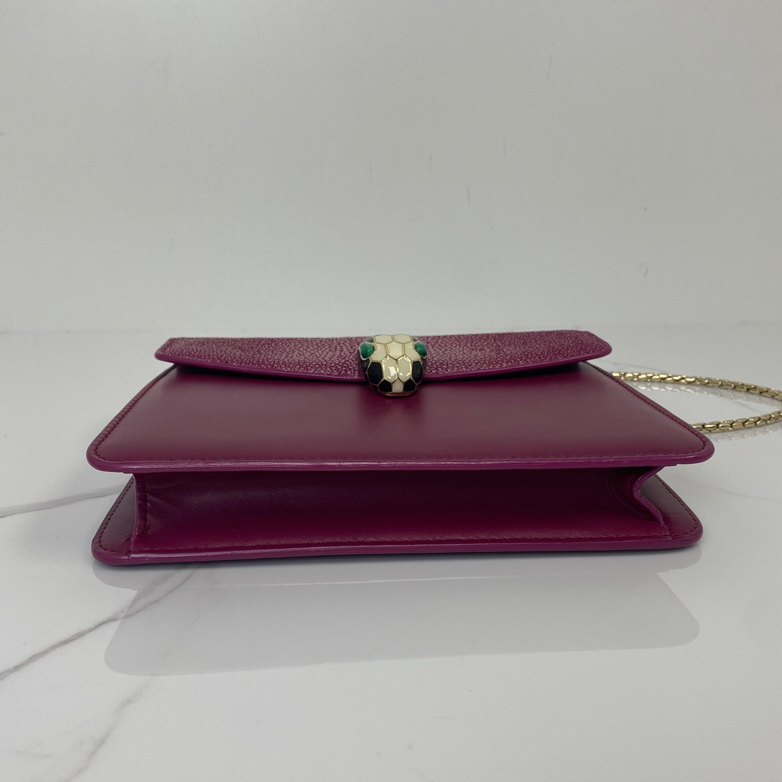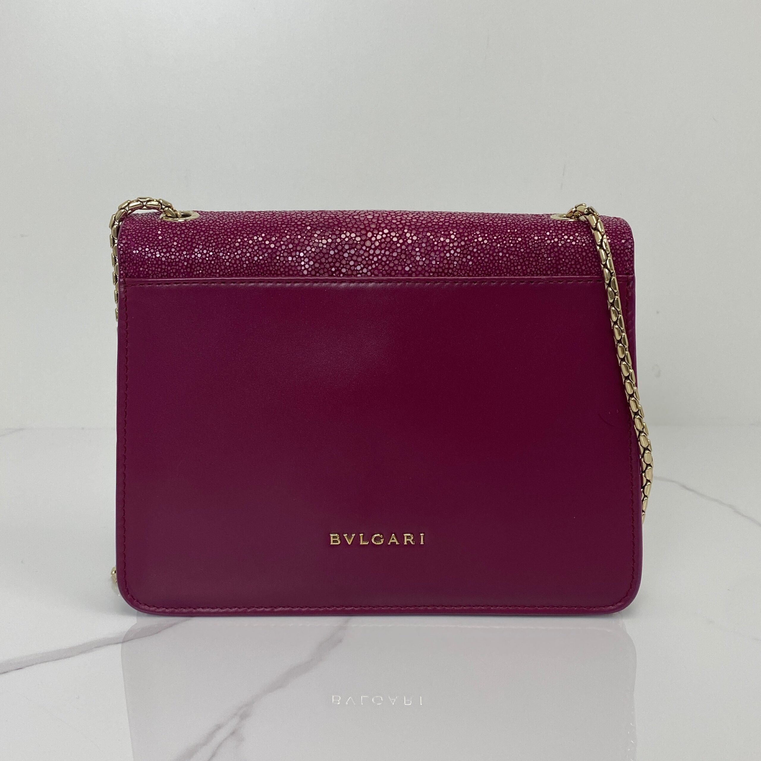 Wrapped in dark pink stingray leather and crowned with the iconic Serpenti head, this Bvlgari bag is pure seduction in motion—crafted for the bold and the unforgettable.
