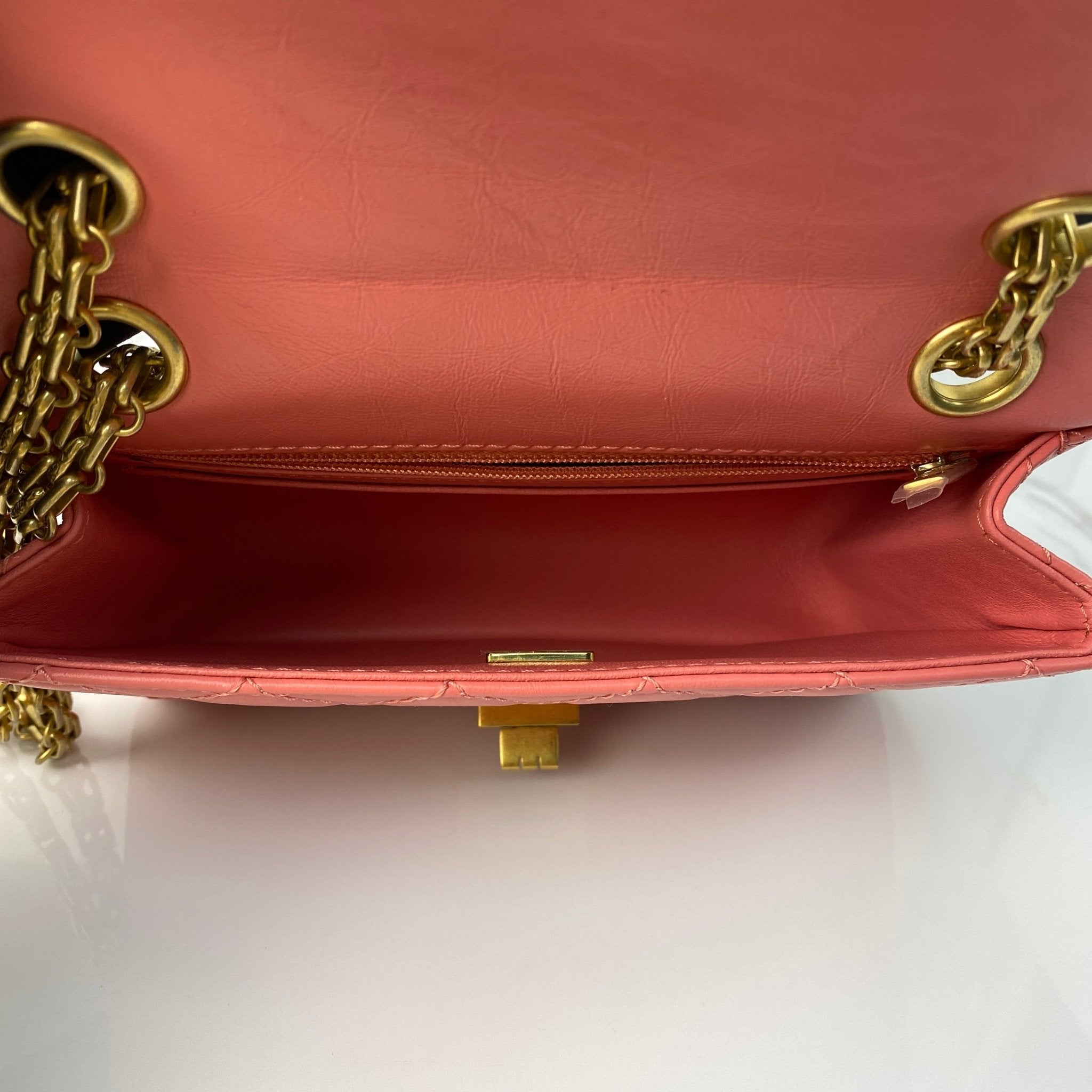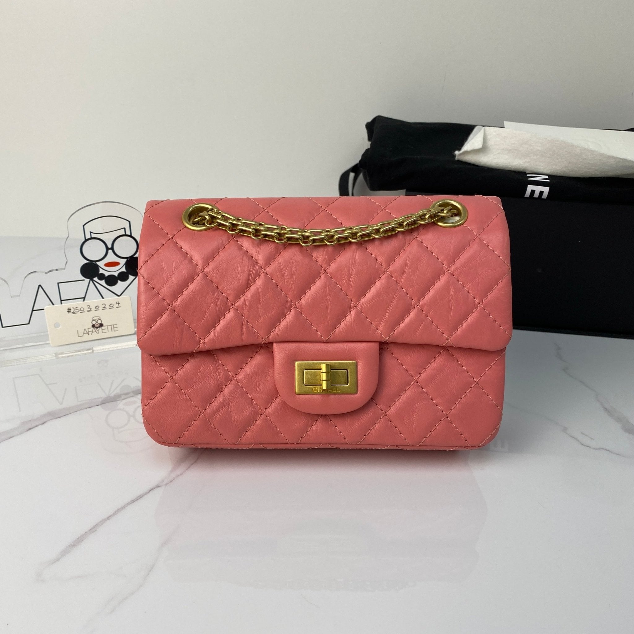 The Chanel 2.55 Reissue Mini Flap in pink aged calfskin is a blend of vintage charm and modern femininity. Wear it crossbody for a chic daytime look or as a clutch for evening elegance. The perfect pop of color to elevate any outfit!