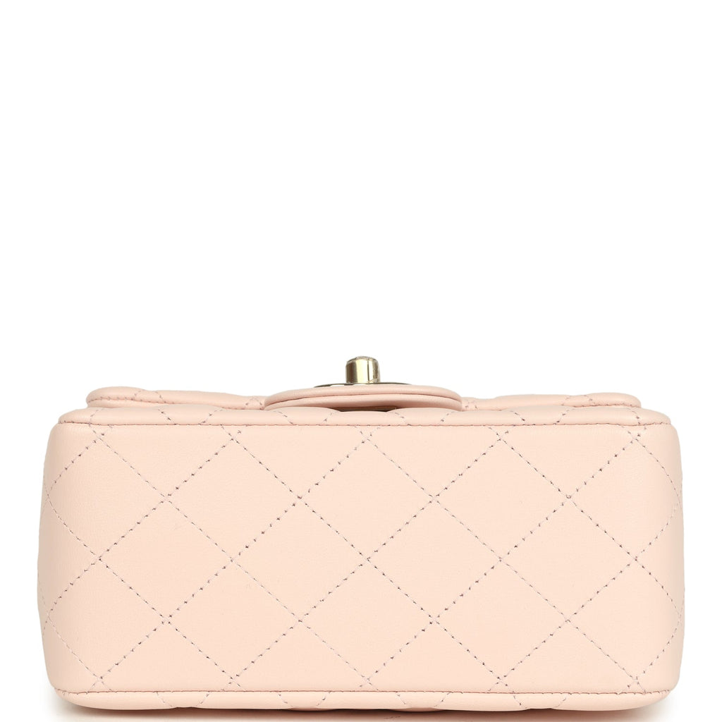 Chanel Mini Classic Square Flap Bag Light Pink Lambskin Light Gold Hardware Shop for an authentic Chanel Mini Square Flap in light pink lambskin leather with light gold tone hardware in never worn condition at Madison Avenue Couture.