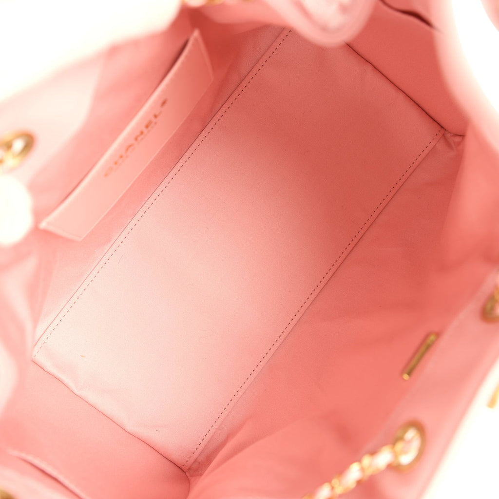 This Chanel Small 25 Hobo Bag is in light pink shiny caviar leather with antique gold hardware, features signature diamond quilt, two exterior side pockets, drawstring closure, and a single interwoven antique gold and light pink leather shoulder strap.The interior is lined in light pink grossgrain fabric and has three small slit pockets; one on the rear wall and one slit pocket on each interior side.