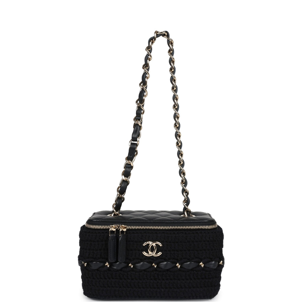 Chanel Small Vanity Case Black Crochet and Lambskin Light Gold Hardware Shop for an authentic Chanel Small Vanity Case in black crochet and lambskin with light gold hardware in new and never worn condition at Madison Avenue Couture.