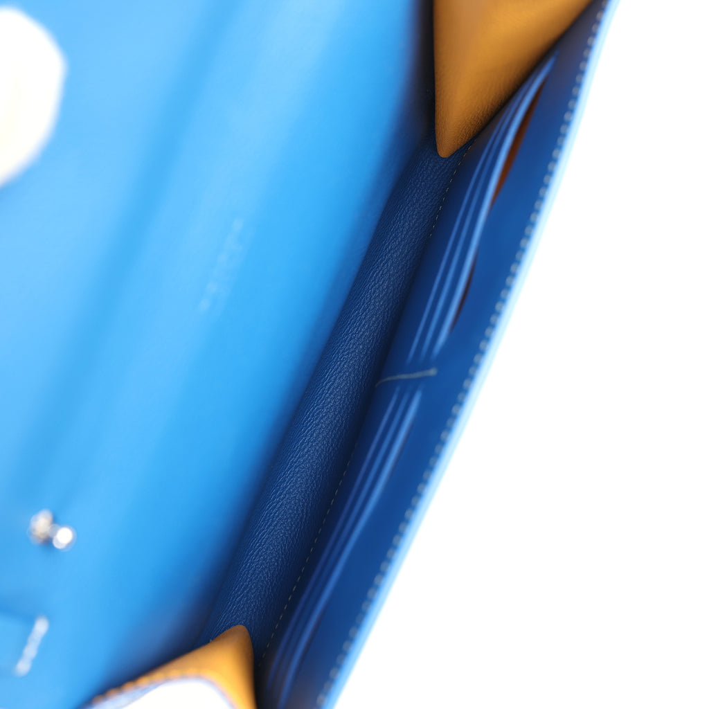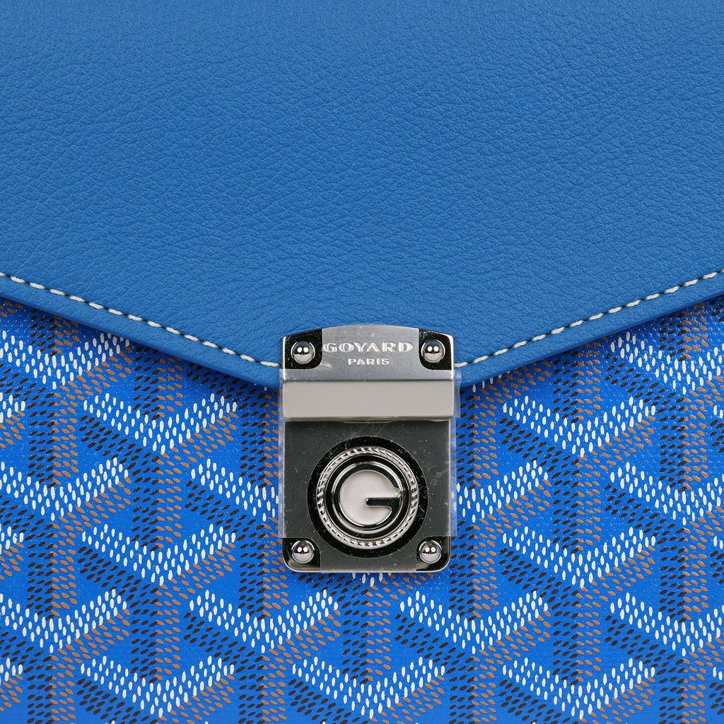 This Goyard Chypre Wallet-Pouch is in sky blue Goyardine coated canvas and chevroches calfskin leather with palladium hardware, featuring contrast stitching, a “G” push lock clasp closure, an exterior slip pocket, and a removable leather strap, and can be worn as a shoulder bag, crossbody bag or handbag.The interior is lined in sky blue and yellow chevroches calfskin leather and has six interior card slots.Origin: FranceCondition: New and never worn (plastic on hardware)Accompanied by: Goyard box, felt, removable shoulder strap, shoulder strap dustbag, carebook, retail tagMeasurements: 8.25″ width x 6″ height x 1.5″ depth; 24″ shoulder strap drop
