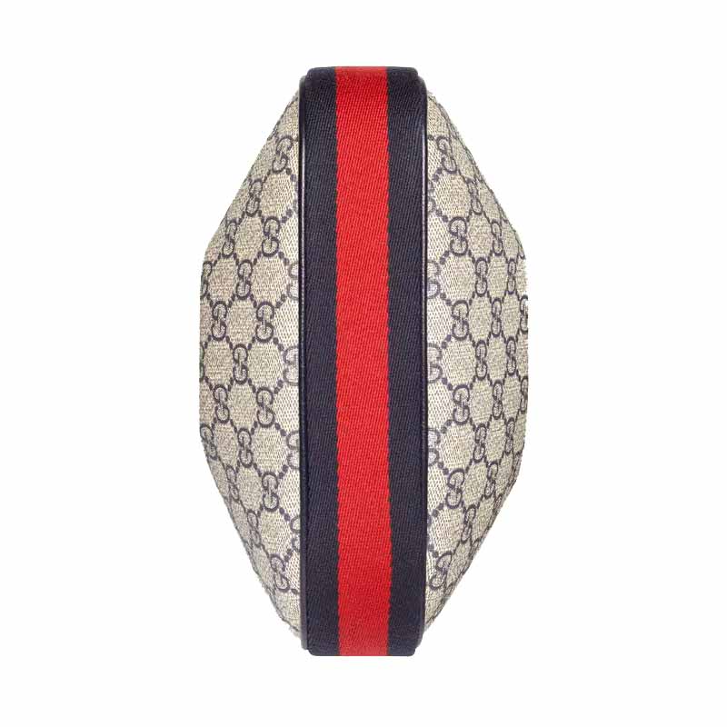 The GG Supreme canvas in beige and blue, adding to the defining feature of the small shoulder bag which is the G-shaped hook closure.