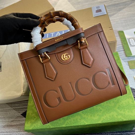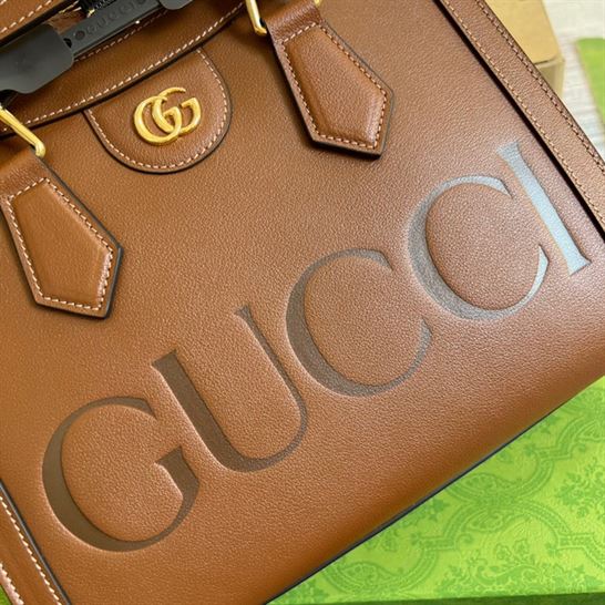 Gucci Diana medium top handle bag Brown leather has an interior open pocket and two zip compartments. Detachable and adjustable shoulder strap with 23.6″ drop