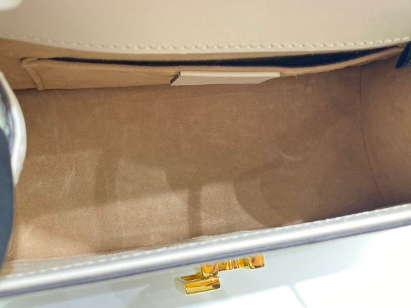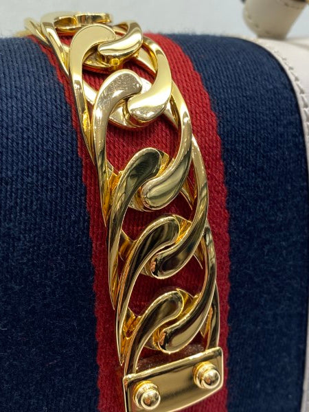 • Material: White Smooth Calf Leather with Navy/Red Web Detail and Red/Blue/White Fabric Shoulder Strap