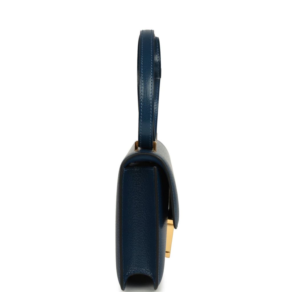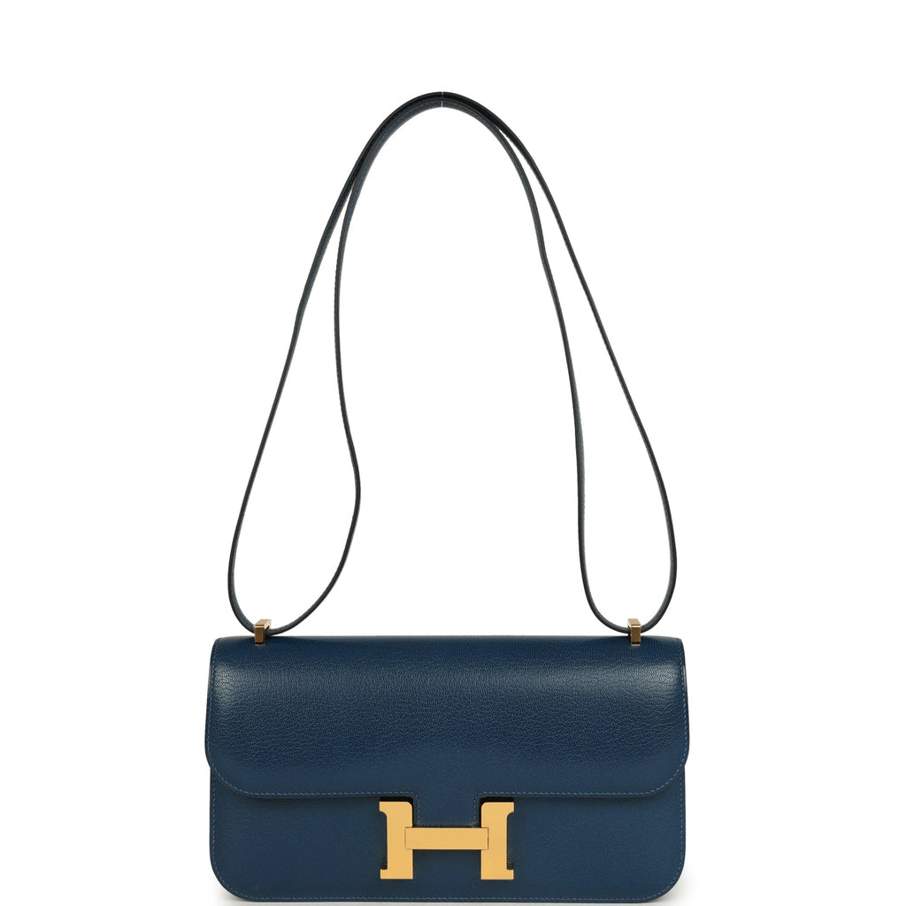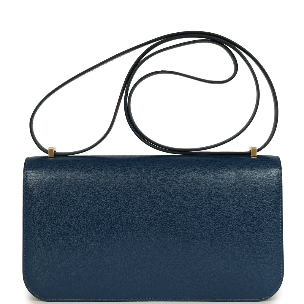 Hermes Constance Elan Deep Blue Chevre Chamkila Gold Hardware Shop for an authentic Hermes Constance Elan in Deep Blue chevre with gold hardware in new and never worn condition at Madison Avenue Couture.