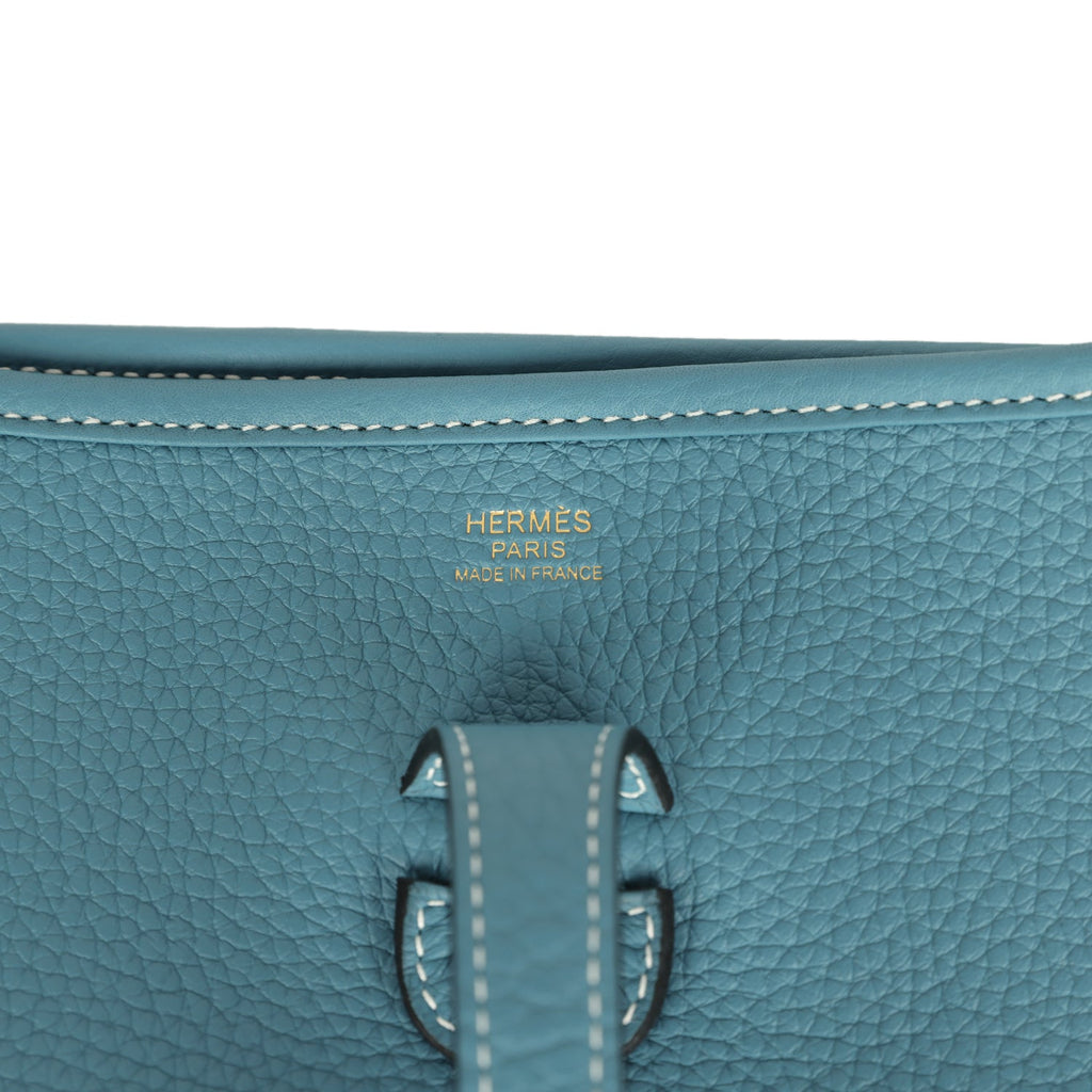 Hermes Evelyne III PM Blue Jean Clemence Gold Hardware Shop for an authentic Hermes Evelyne PM in New Blue Jean in clemence leather with gold hardware in new and never worn condition at Madison Avenue Couture.