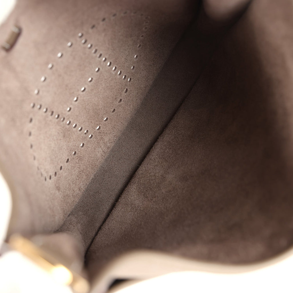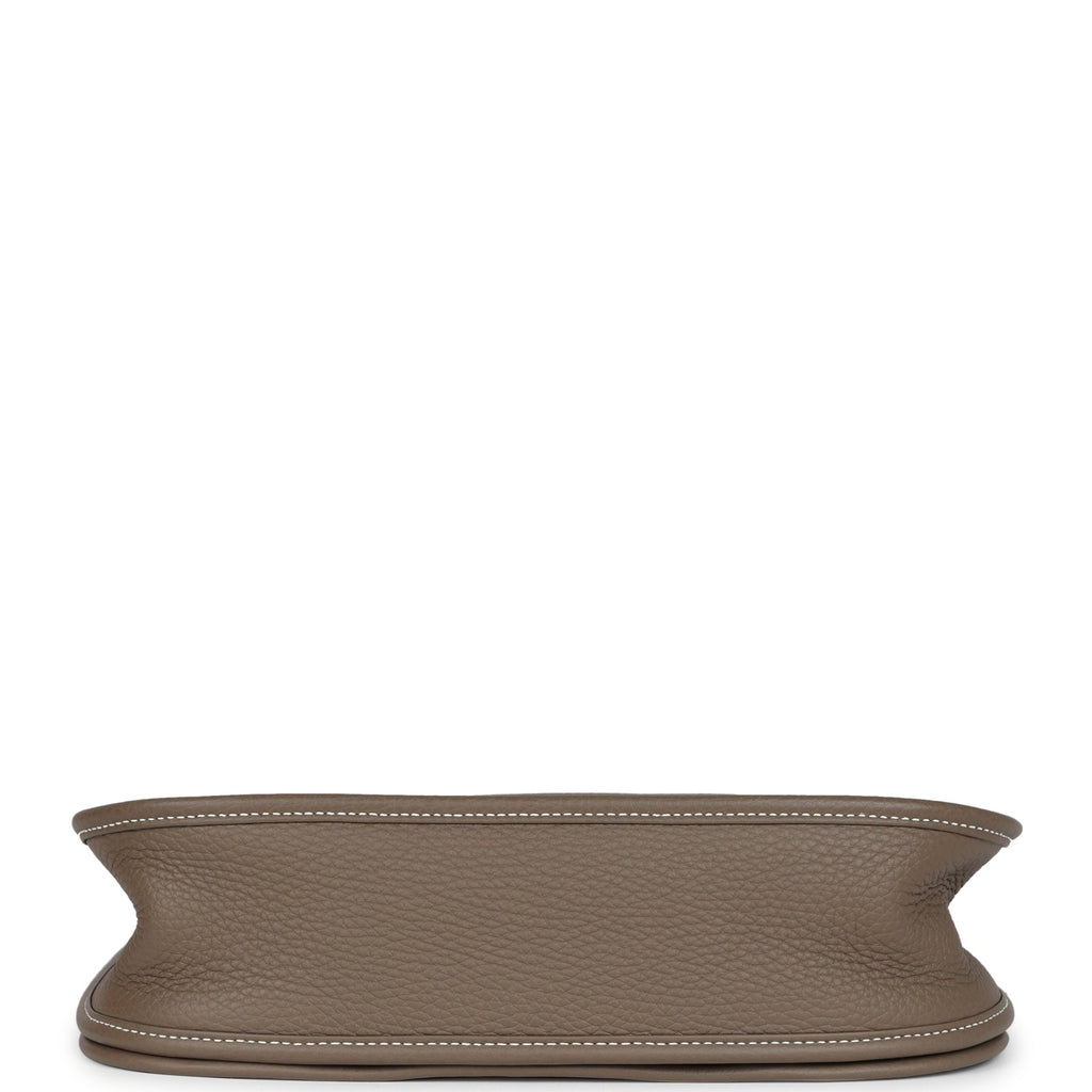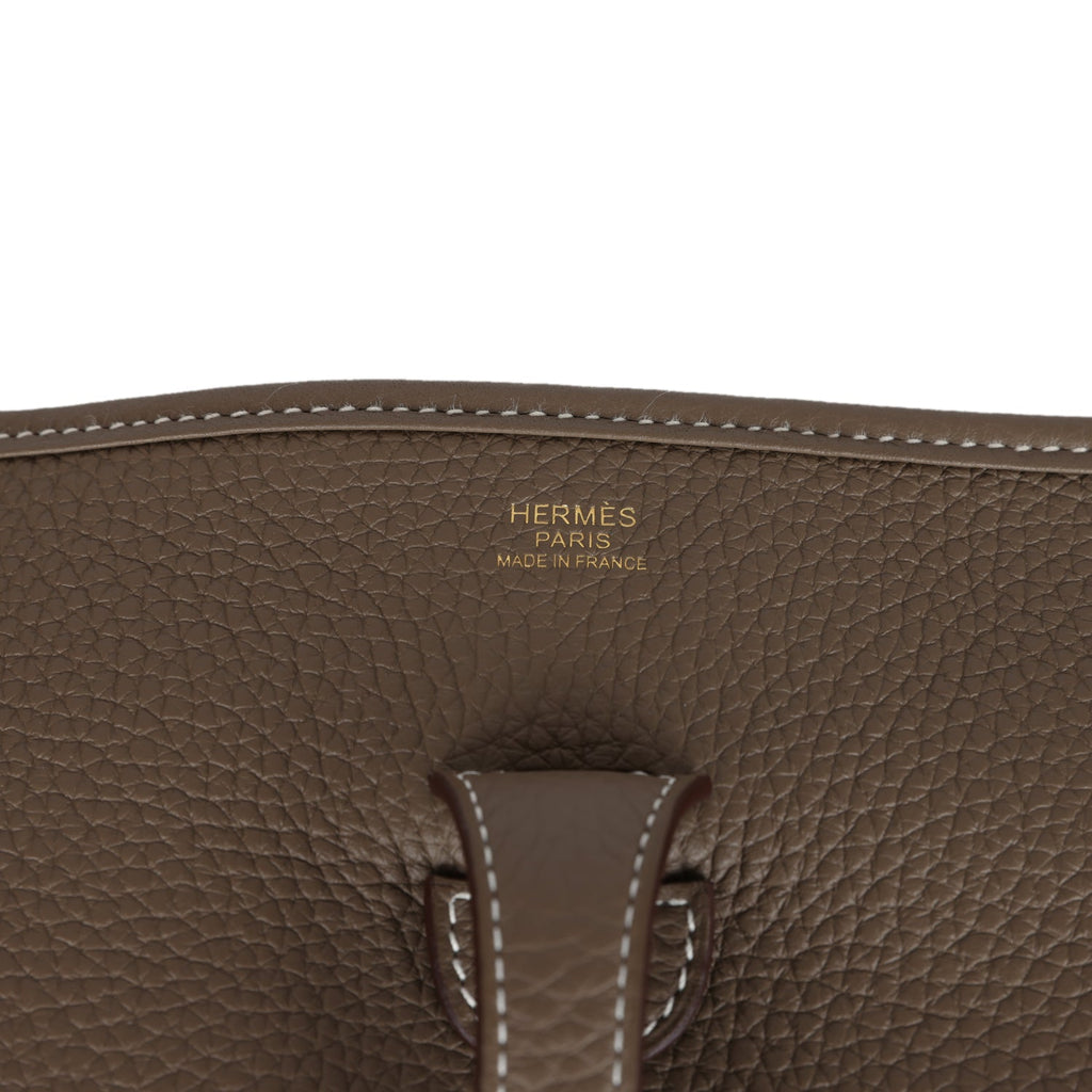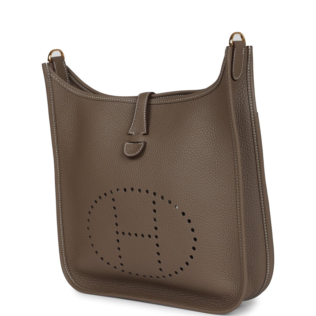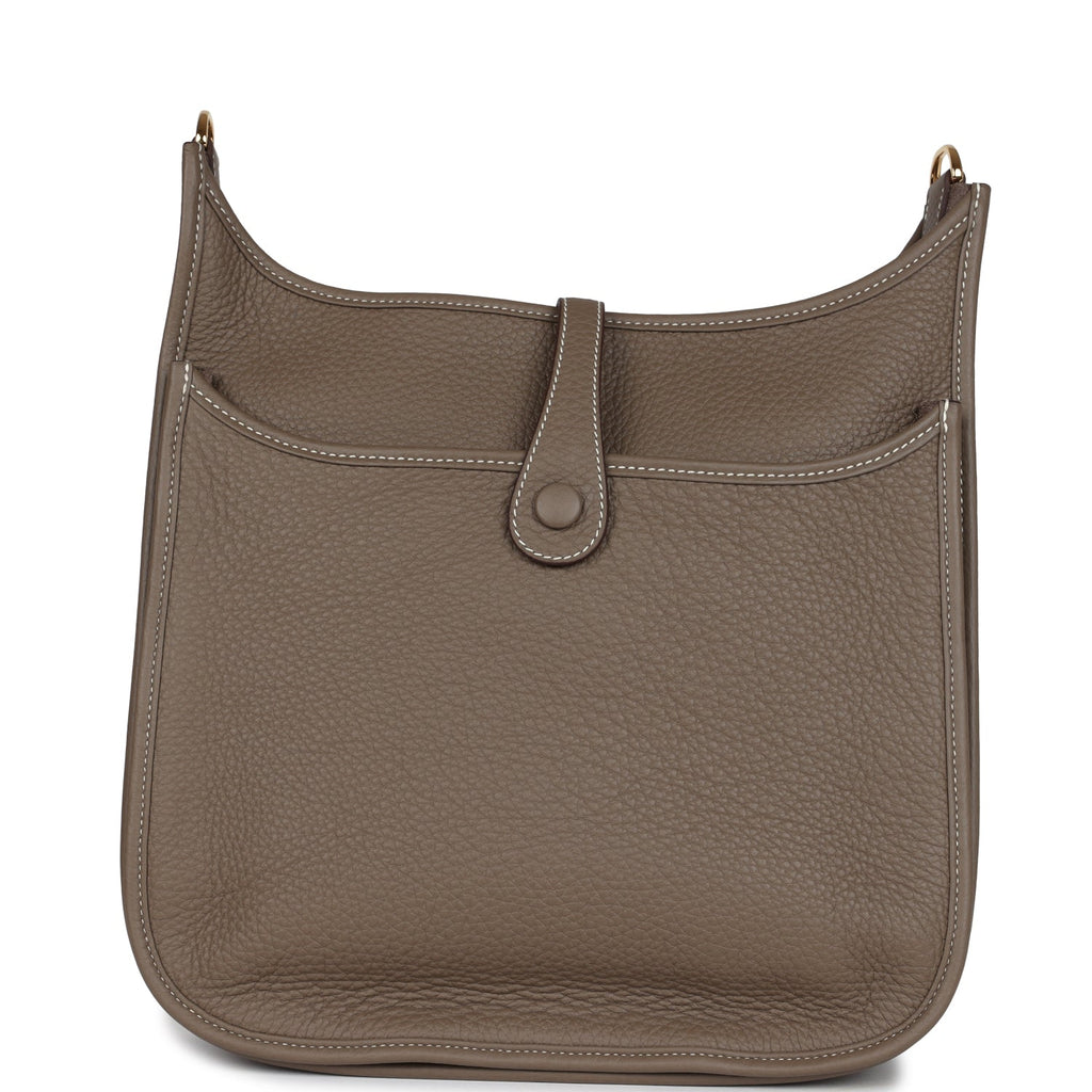 Hermes Evelyne III PM Etoupe Clemence Gold Hardware Shop for an authentic Hermes Evelyne PM in Etoupe clemence leather with gold hardware in new and never worn condition at Madison Avenue Couture.