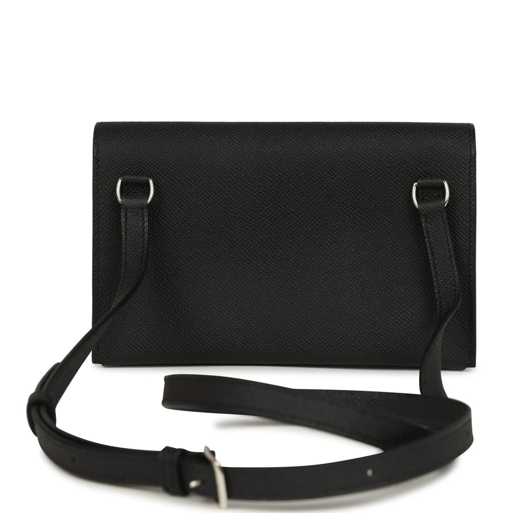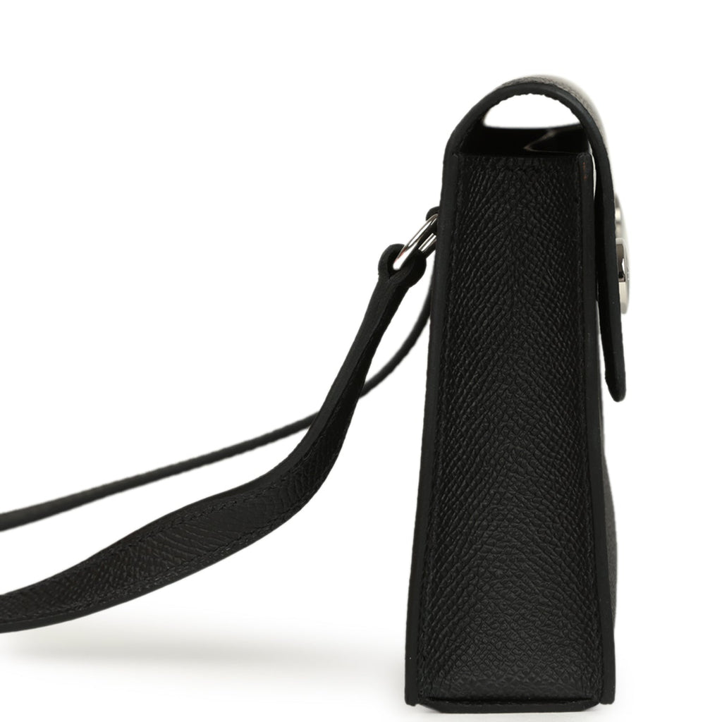 This Hermes Hermesnap Wallet is in Black epsom leather with black enamel and palladium hardware, featuring two Clou de Selle snap closures and an adjustable flat leather shoulder/crossbody strap.The interior is lined in Black epsom leather and has one small slit pocket on front wall of wallet.Collection: W (2024)Origin: FranceCondition: New and never worn Accompanied by: Hermes box, two strap dustbags, ribbonMeasurements: 7.25″ width x 4.5″ width x 1.5″ depth; adjustable strap: 18″-21″ (approx.)