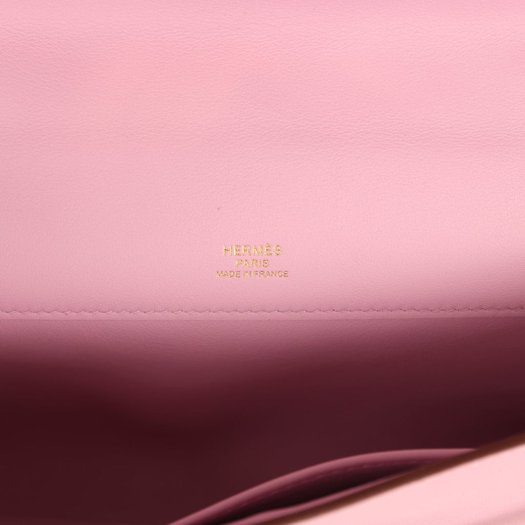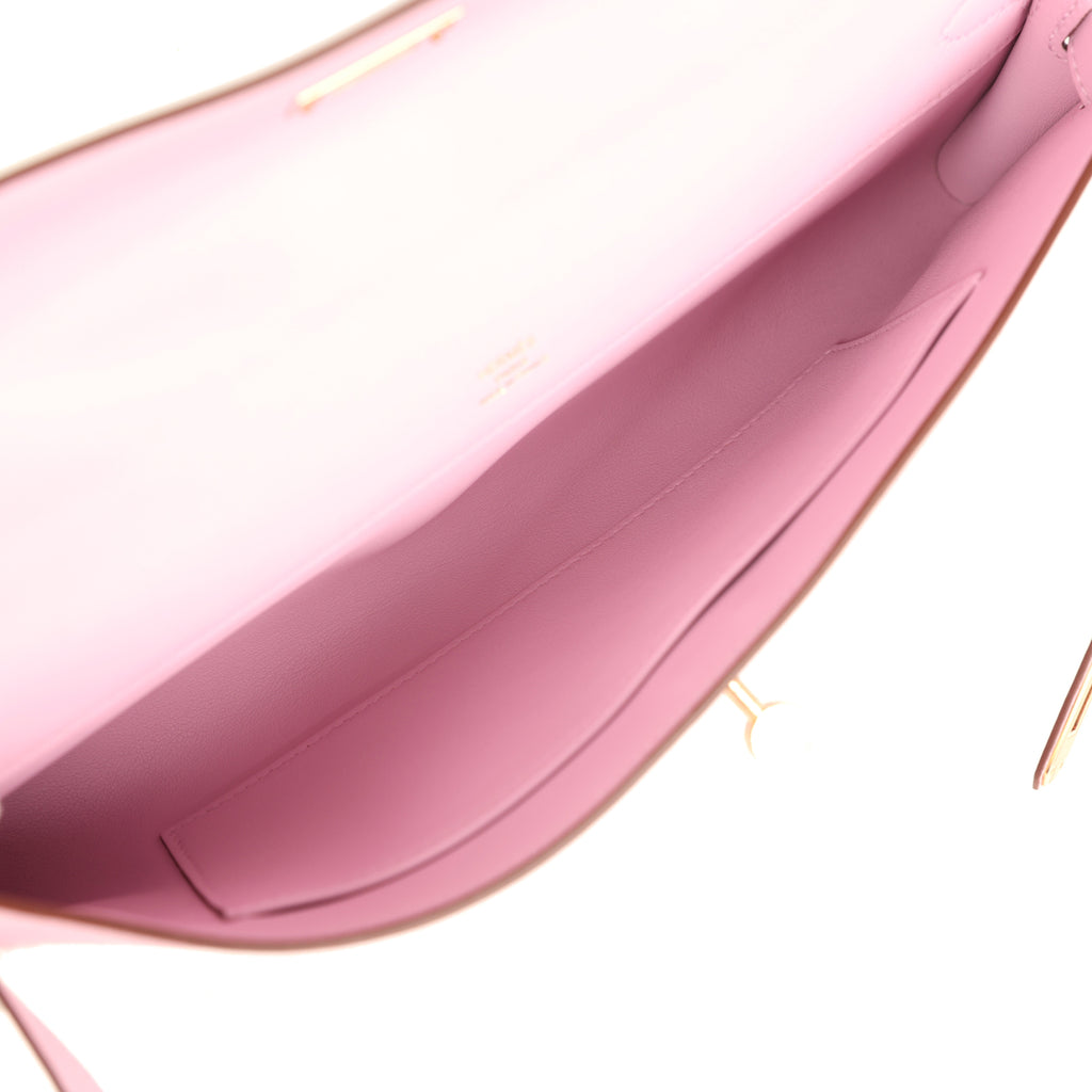 Hermes Kelly Cut Mauve Sylvestre Swift Rose Gold Hardware Shop for an authentic Hermes Kelly Cut in Mauve Sylvestre swift leather with rose gold hardware in new and never worn condition at Madison Avenue Couture.