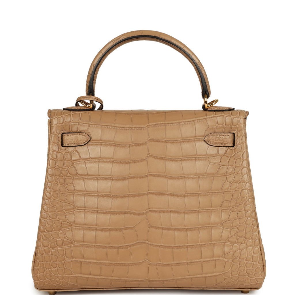 Hermes Kelly Retourne 25 Chai Matte Alligator Gold Hardware Shop for an authentic Hermes Kelly Retourne 25 in Chai Matte Alligator with gold hardware in new and never worn condition at Madison Avenue Couture.