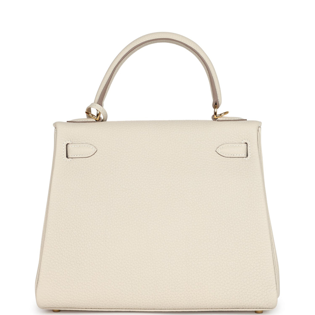 Hermes Kelly Retourne 25 Craie Togo Gold Hardware Shop for an authentic Hermes Kelly Retourne 25 in Craie togo leather with gold hardware in new and never worn condition at Madison Avenue Couture.