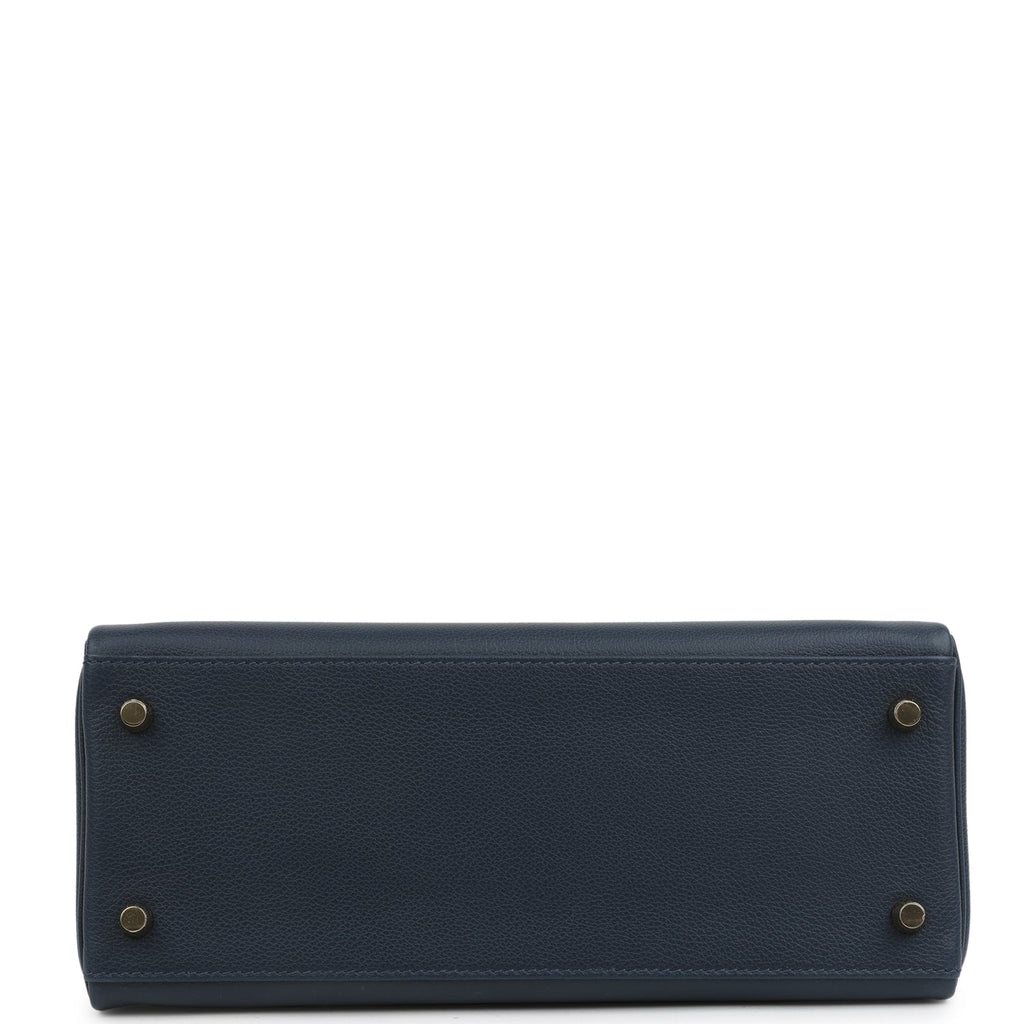 Hermes Kelly Retourne 28 Bleu Abysse Evercolor Gold Hardware Shop for an authentic Hermes Kelly Retourne 28 in Bleu Abysse evercolor leather with gold hardware in new and never worn condition at Madison Avenue Couture.