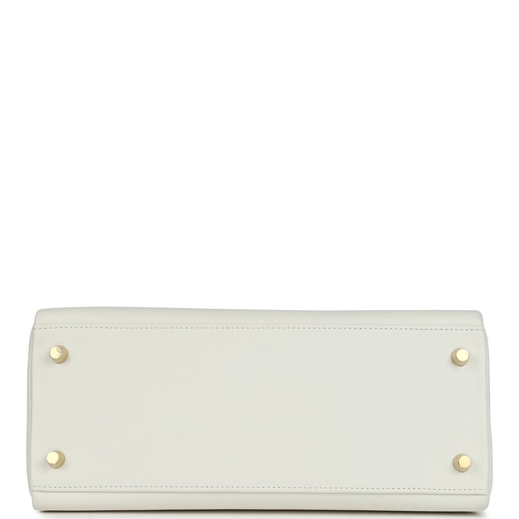 Hermes Kelly Retourne 28 White Evercolor Gold Hardware Shop for an authentic Hermes Kelly Retourne 28 in White evercolor leather with gold hardware in new and never worn condition at Madison Avenue Couture.