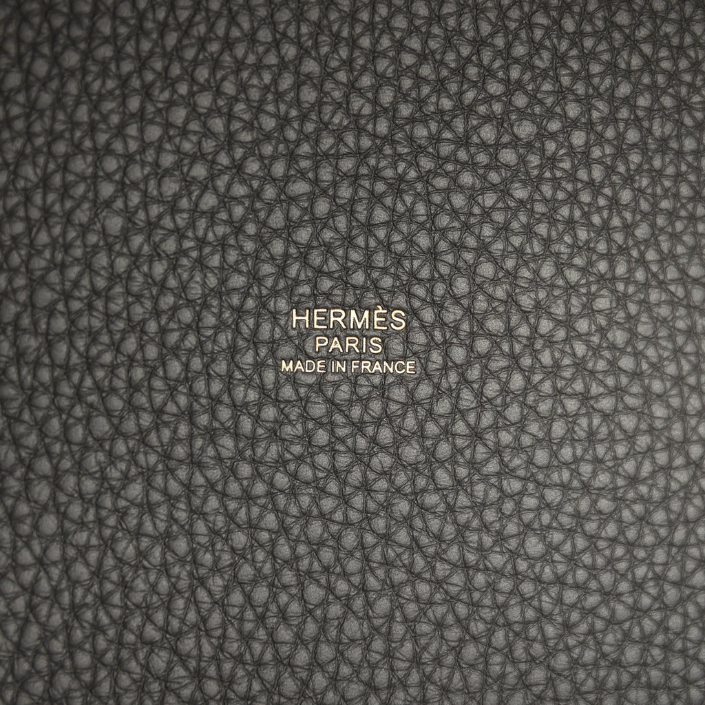 This Picotin Lock is in Dark Bronze clemence leather with gold hardware and has contrast stitching with two top handles.The interior is lined with Dark Bronze natural leather, no interior pockets and has a pull through closure secured by padlock.Collection: K (2025) Origin: FranceCondition: New and never worn (plastic on hardware)Accompanied by: Hermes box, Hermes dustbag, lock, keys, lock and key dustbag, carebook and ribbonMeasurements: 7″ width x 7.5″ height x 5.5″ depth; 5.5″ handles