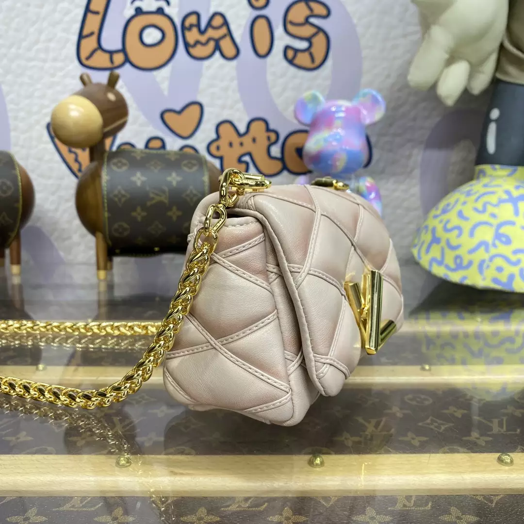 Soft lambskin with a malletage design inspired by the pattern inside the House’s old trunks crafts the Pico GO-14 handbag.