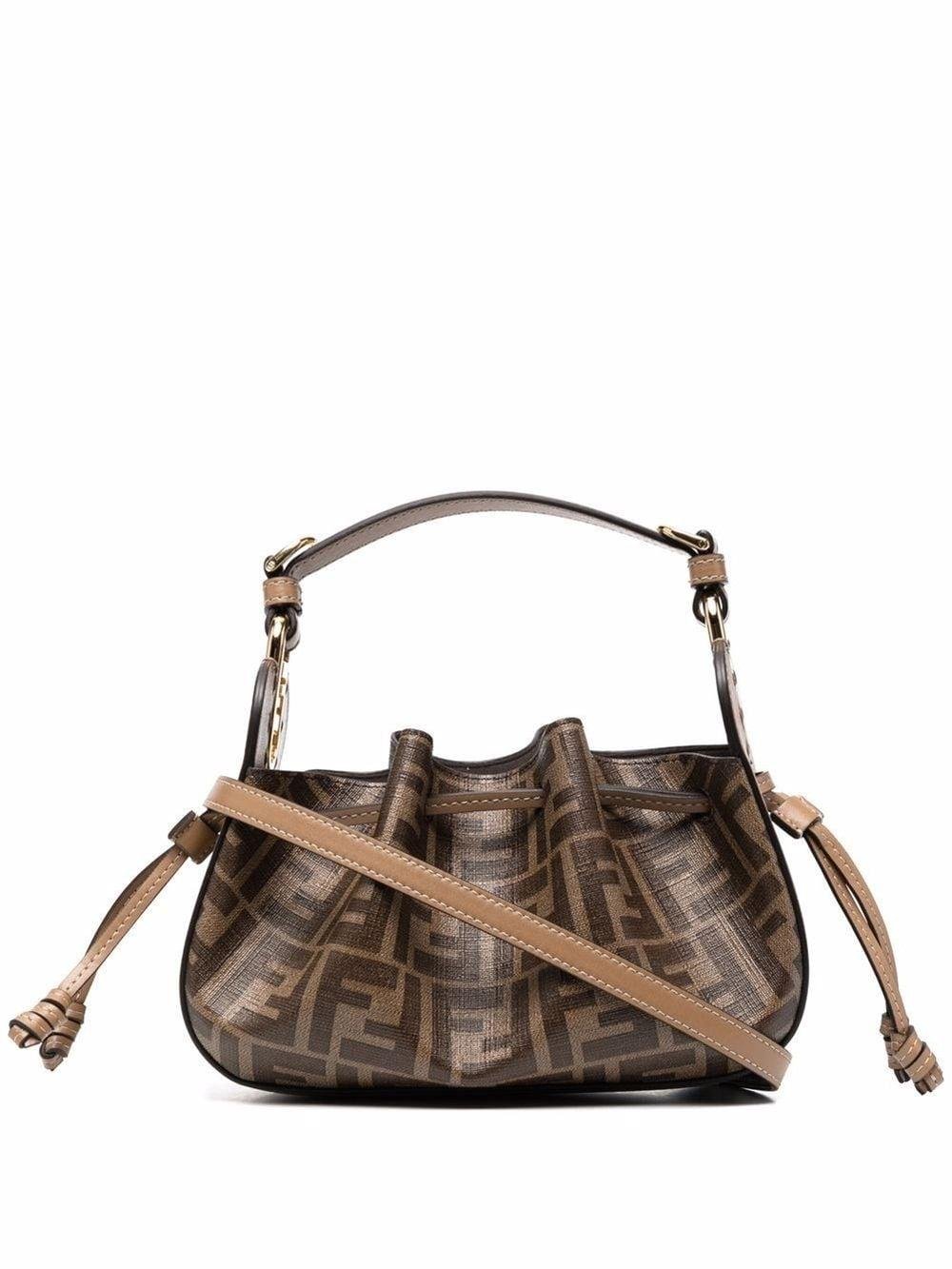 Mini-bag with drawstring closure made of PU fabric with brown FF print. Finished with beige leather details.
