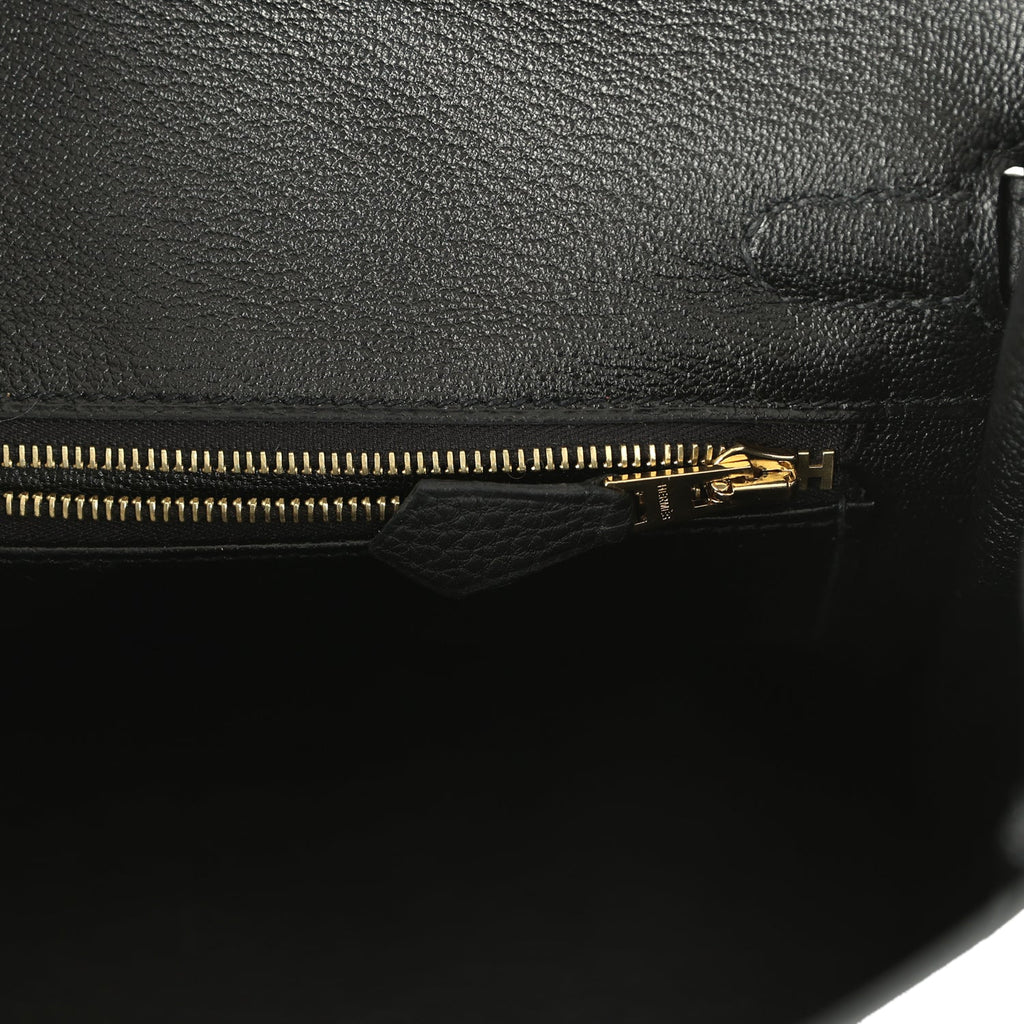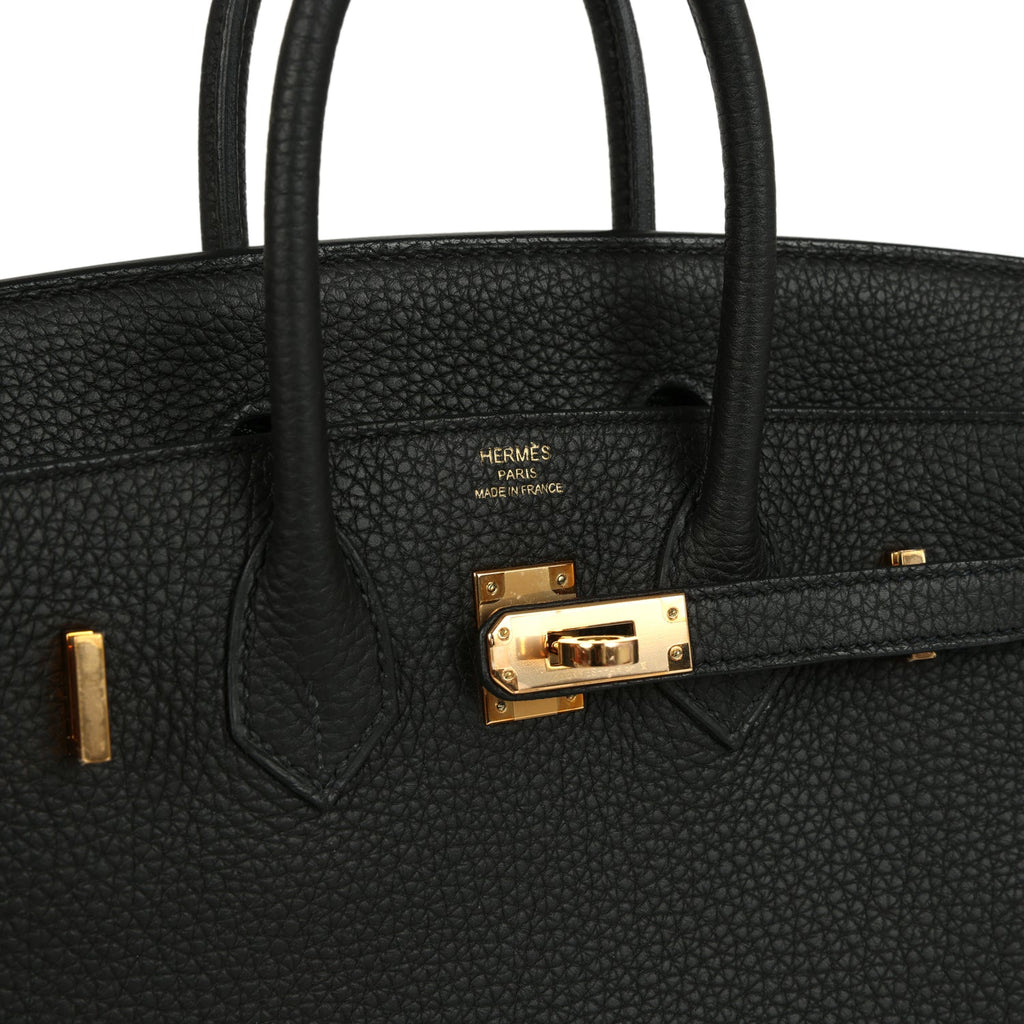 This Birkin is in Black togo leather with rose gold hardware, has tonal stitching, front flap, two straps with center toggle closure, clochette with lock and two keys, and double rolled handles.The interior is lined with Black chevre leather and has a zip pocket with an Hermes engraved zipper pull and an open pocket on the opposite side.Collection: D (2019) Origin: FranceCondition: Pre-owned; Mint – This bag retains its shape structure. There is partial plastic on the hardware. The exposed turnlock and one foot have some light scratching present. The exterior leather is clean with minimal signs of wear. The interior leather has a few faint press marks to the base but is otherwise clean.Accompanied by: Hermes box, Hermes dustbag, felt, clochette, lock, two keys, clochette dustbag, carebook, rainhatMeasurements: 10″ width x 7.5″ height x 4.75″ depth; 2.75″ handle drop