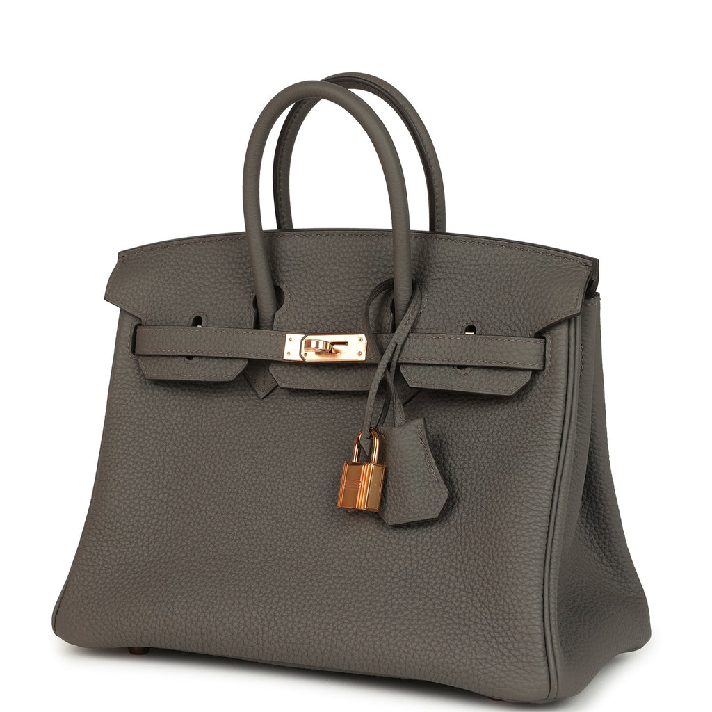 Pre-owned Hermes Birkin 25 Etain Togo Rose Gold Hardware Shop for an authentic pre-owned Hermes Birkin 25 in Etain togo leather with rose gold hardware in mint condition at Madison Avenue Couture.
