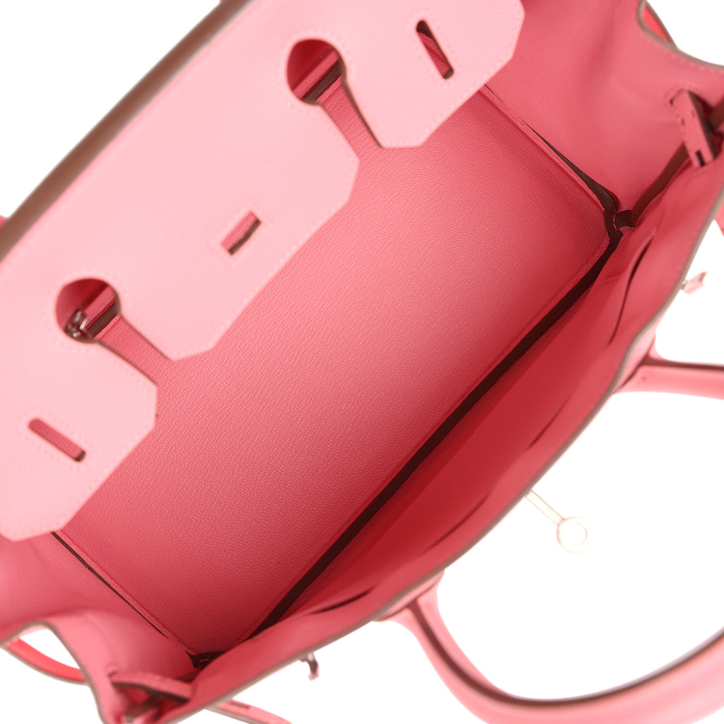 This Birkin is in Rose Confetti epsom with palladium hardware and features tonal stitching, front flap, two straps with center toggle closure, clochette with lock and two keys, and double rolled handles. The interior is lined with Rose Confetti chevre and has a zip pocket with an Hermes engraved zipper pull and an open pocket on the opposite side.Collection: Z (2021) Origin: FranceCondition: Pre-owned; Mint – This bag retains its shape structure. There is plastic on all the hardware. The exterior leather is mostly clean with the exception of some tiny chipping and rubbing to the leather on the bottom corners and bottom edge piping and a tiny scratch to the right side of the front top handle. The interior leather is clean with no signs of wear.Accompanied by: Hermes box, Hermes dustbag, clochette, lock, two keys, clochette dustbag, carebookMeasurements: 11.75″ width x 9.5″ height x 6″ depth; 4.25″ handle drop
