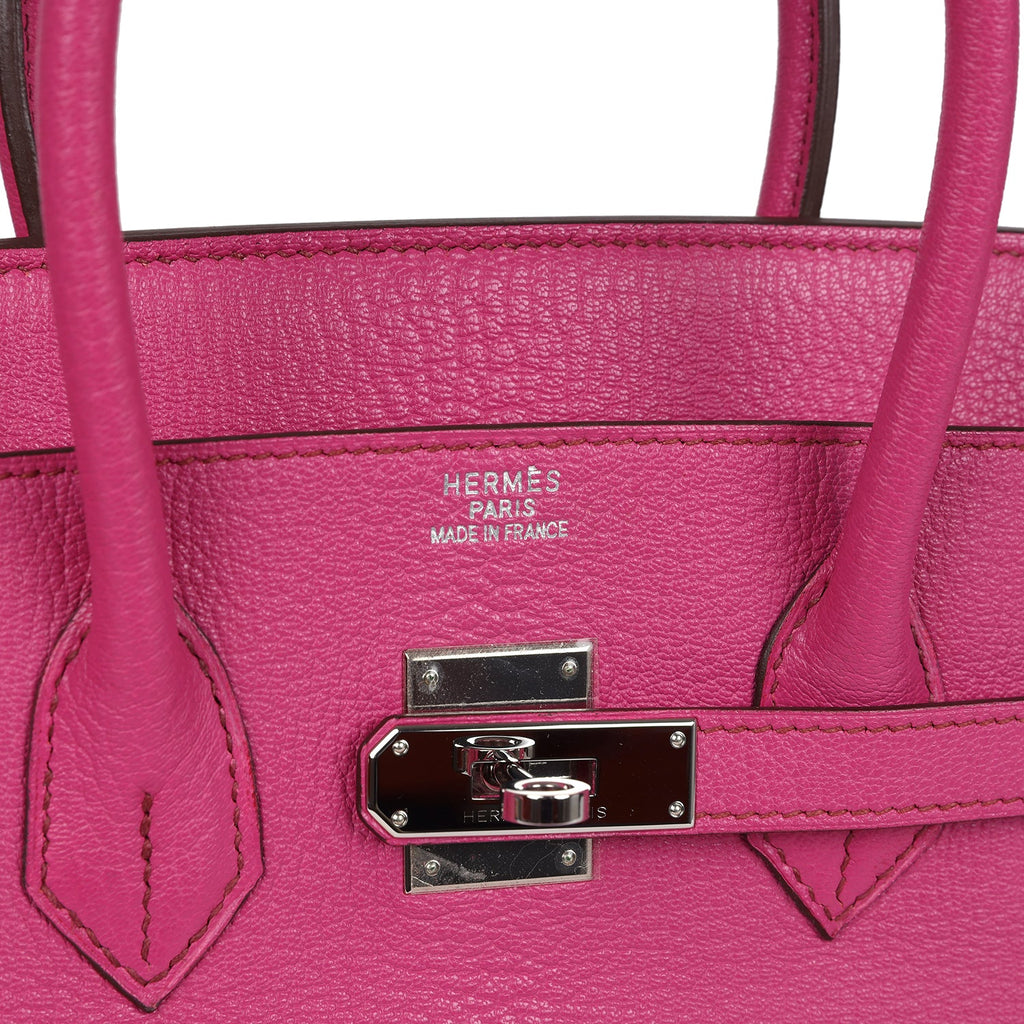 This Birkin is in Rose Shocking chevre mysore leather with palladium hardware and has contrast stitching, front flap, two straps with center toggle closure, clochette with lock and two keys, and double rolled handles.The interior is lined with Rose Shocking chevre and has one zip pocket with an Hermes engraved zipper pull and an open pocket on the opposite side.Collection: L Square (2008)Origin: FranceCondition: Pre-owned; Excellent – This bag is slightly relaxed in shape along the sides of the bag. There is no plastic on the hardware. There are very light hairline scratches on one of the pull strap plaques and to the bottom feet. The exterior leather is clean overall with no signs of wear except a small press marks on the front flap. The pull straps are a little loose. The interior leather is clean overall with a few light press marks to the interior base.Accompanied by: MAC dustbag, lock, two keys, clochetteMeasurements: 13.75″ width x 11″ height x 7″ depth; 4.25″ handle drop