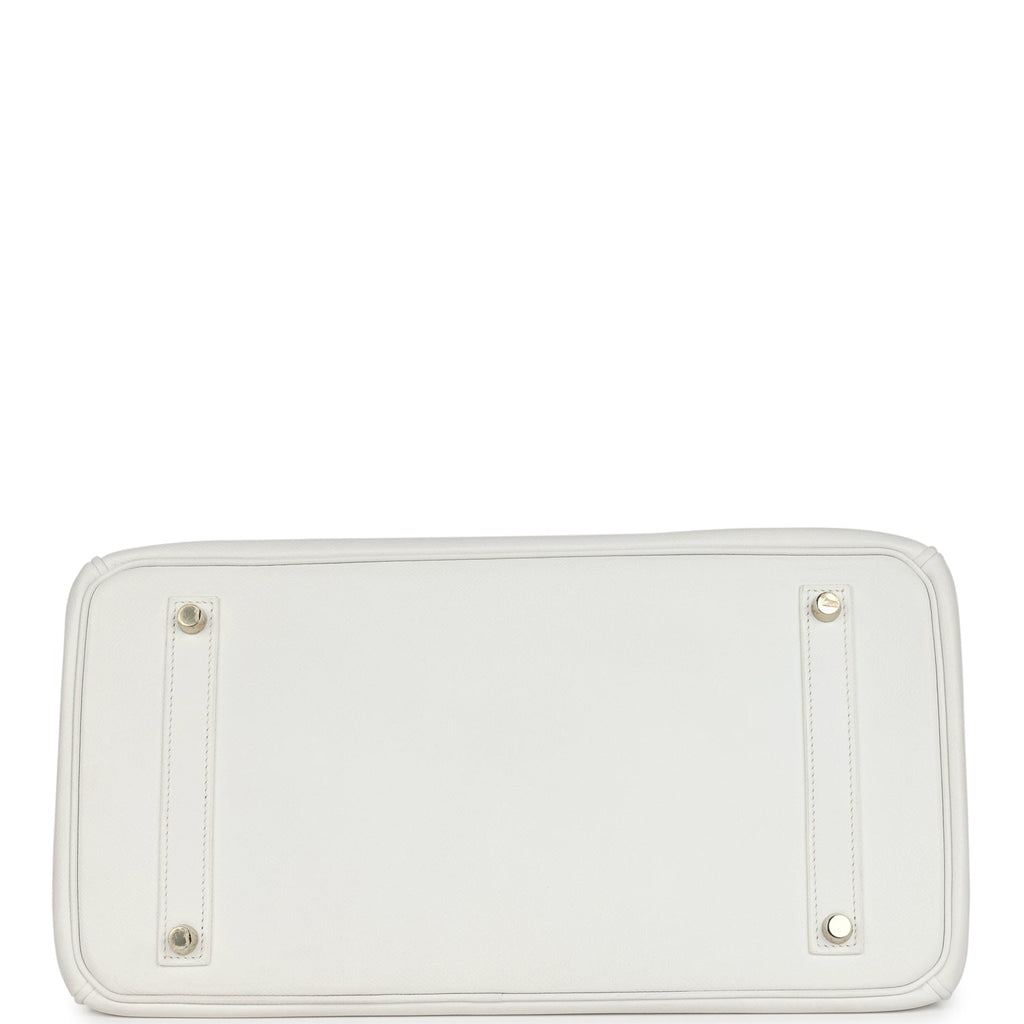 This Birkin is in White epsom leather with gold hardware and has tonal stitching, front flap, two straps with center toggle closure, clochette with lock and two keys, and double rolled handles.The interior is lined with White chevre and has one zip pocket with an Hermès engraved zipper pull and an open pocket on the opposite side.Collection: L Square (2008)Origin: FranceCondition: Pre-owned; Excellent – This bag is relaxed in shape structure in the front. There is no plastic on the hardware. There are visible scratches to the exposed hardware. The exterior leather has some creasing along the sides, yellowing to the exterior stitches, and the handles are slightly leaning. There is some darkening to the leather towards the bottom of the bag and a few tiny scuff marks on the back. The interior leather has some yellowing due to age, discoloration to the stitches and some cracking to the edge paint/resin along the top underneath the flap.Accompanied by: MAC dustbag, clochette, two keys, lock, clochette dustbagMeasurements: 13.75″ width x 11″ height x 7″ depth; 4.25″ handle drop