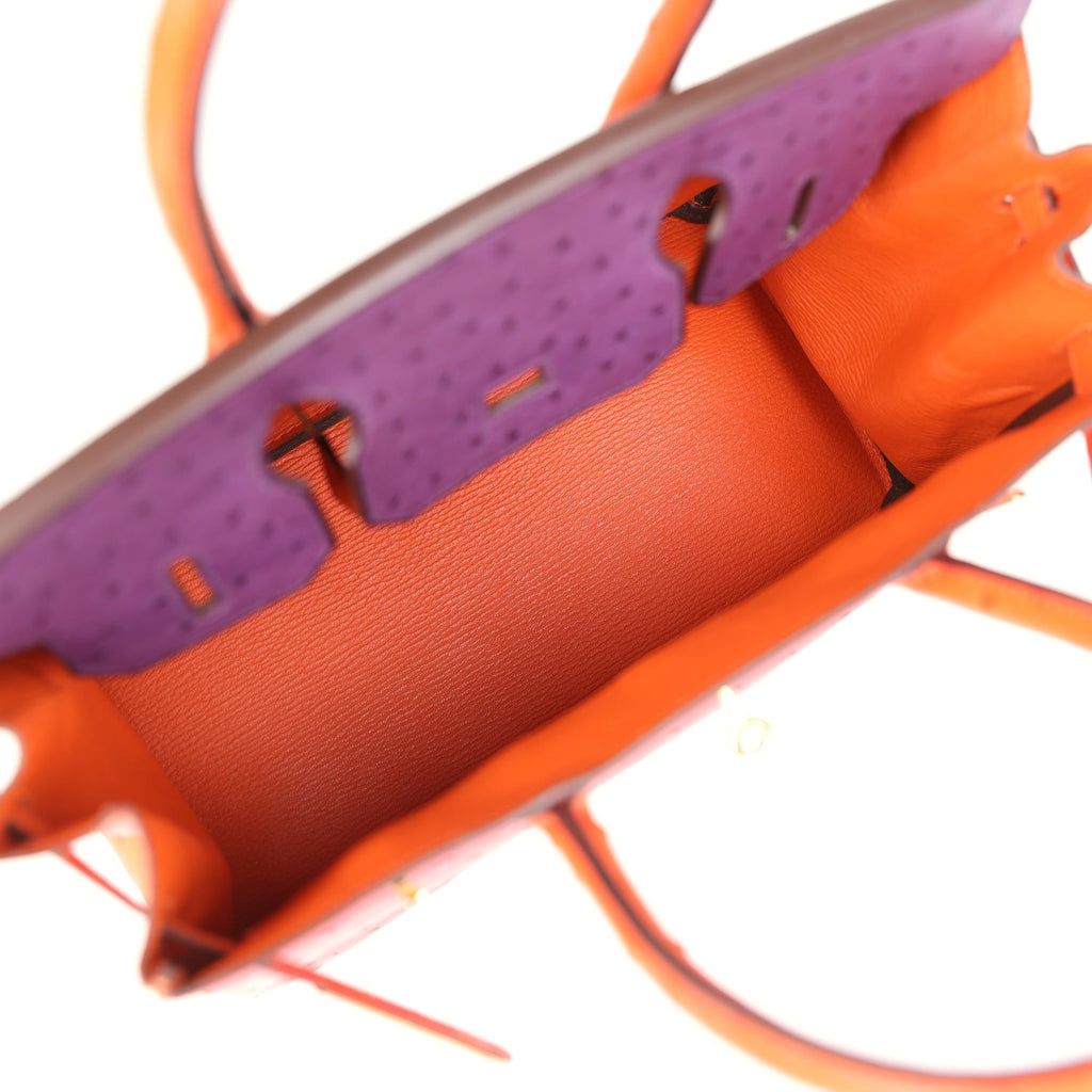 Pre-owned Hermes Special Order (HSS) Birkin 30 Tangerine, Violet and Bougainvillea Ostrich Gold Hardware Shop for an authentic pre-owned Hermes (HSS) Birkin 30 in Tangerine, Violet and Bougainvillea ostrich leather with gold hardware in excellent to mint condition at Madison Avenue Couture.