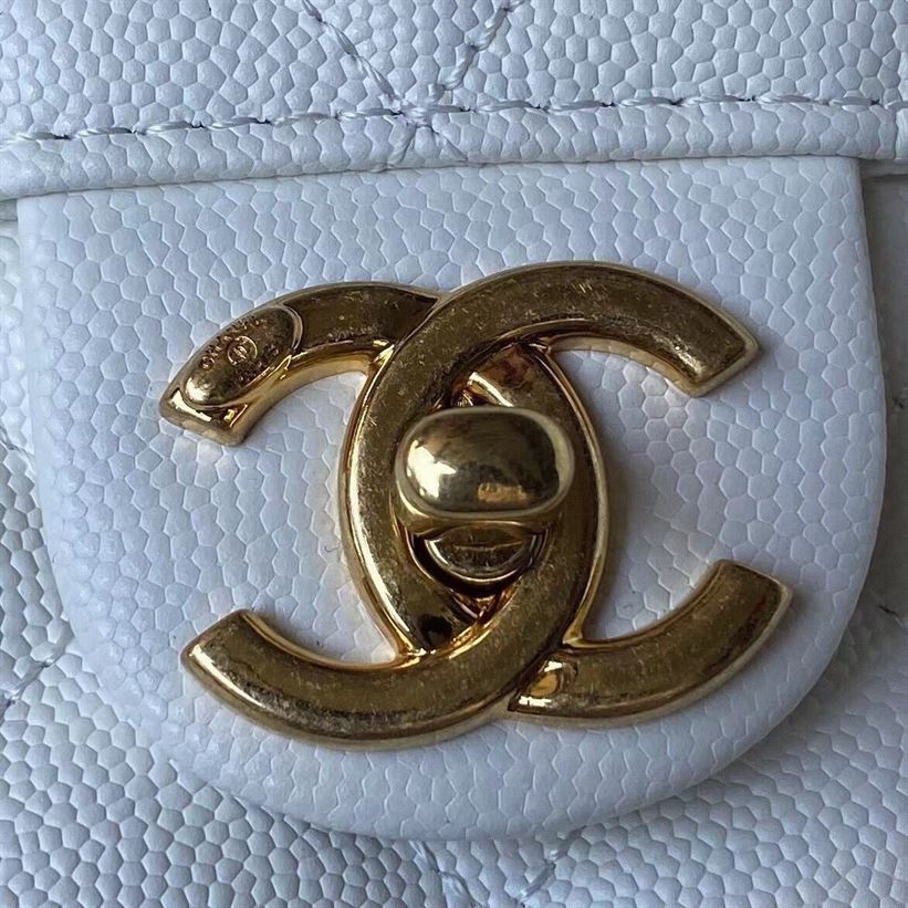 Small Vanity Case White Grained Calfskin has adjustable Chain Shoulder Strap. Designer interlocking C detailed. Beautifully structured flap-over design
