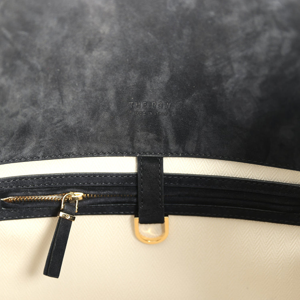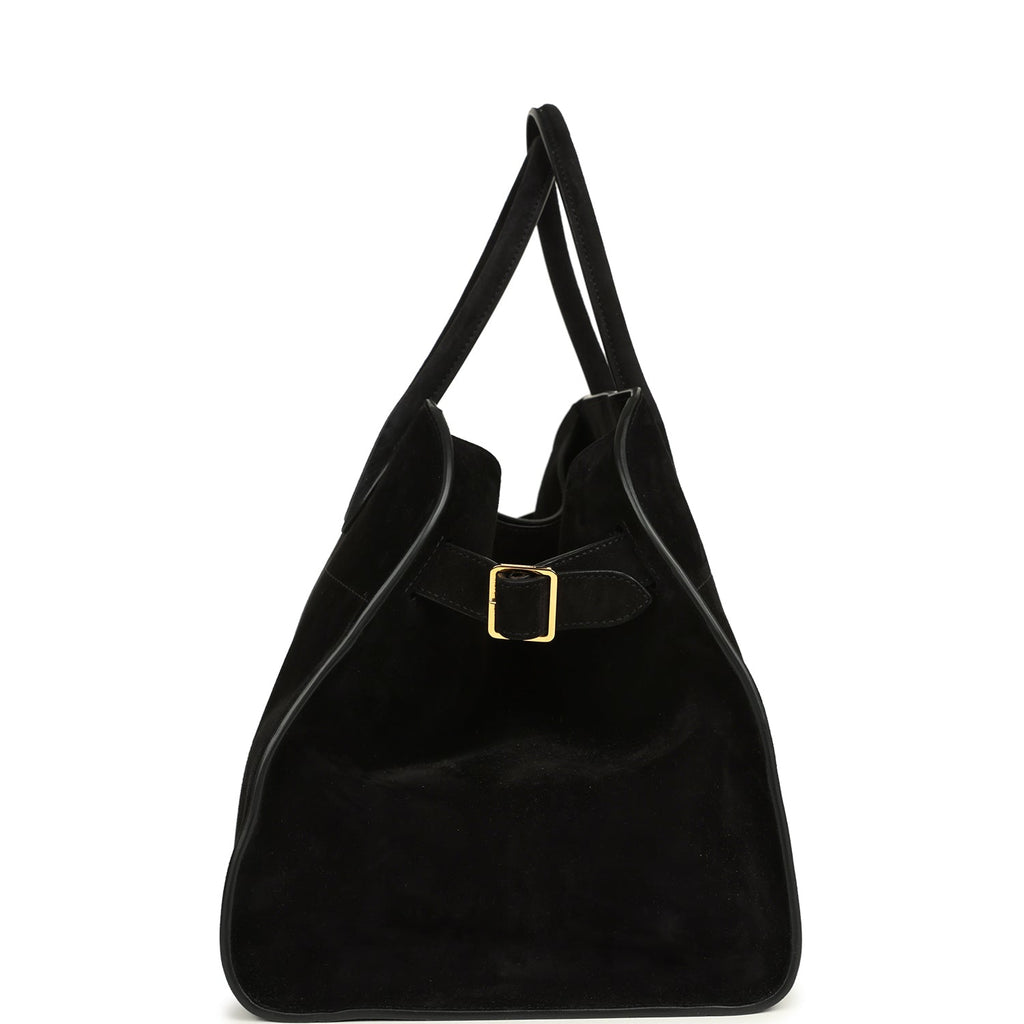 The Row Soft Margaux 15 Bag Black Suede Gold Hardware Shop for an authentic The Row Soft Margaux 15 Top Handle Bag is in black suede leather with gold hardware in new and never worn condition at Madison Avenue Couture.