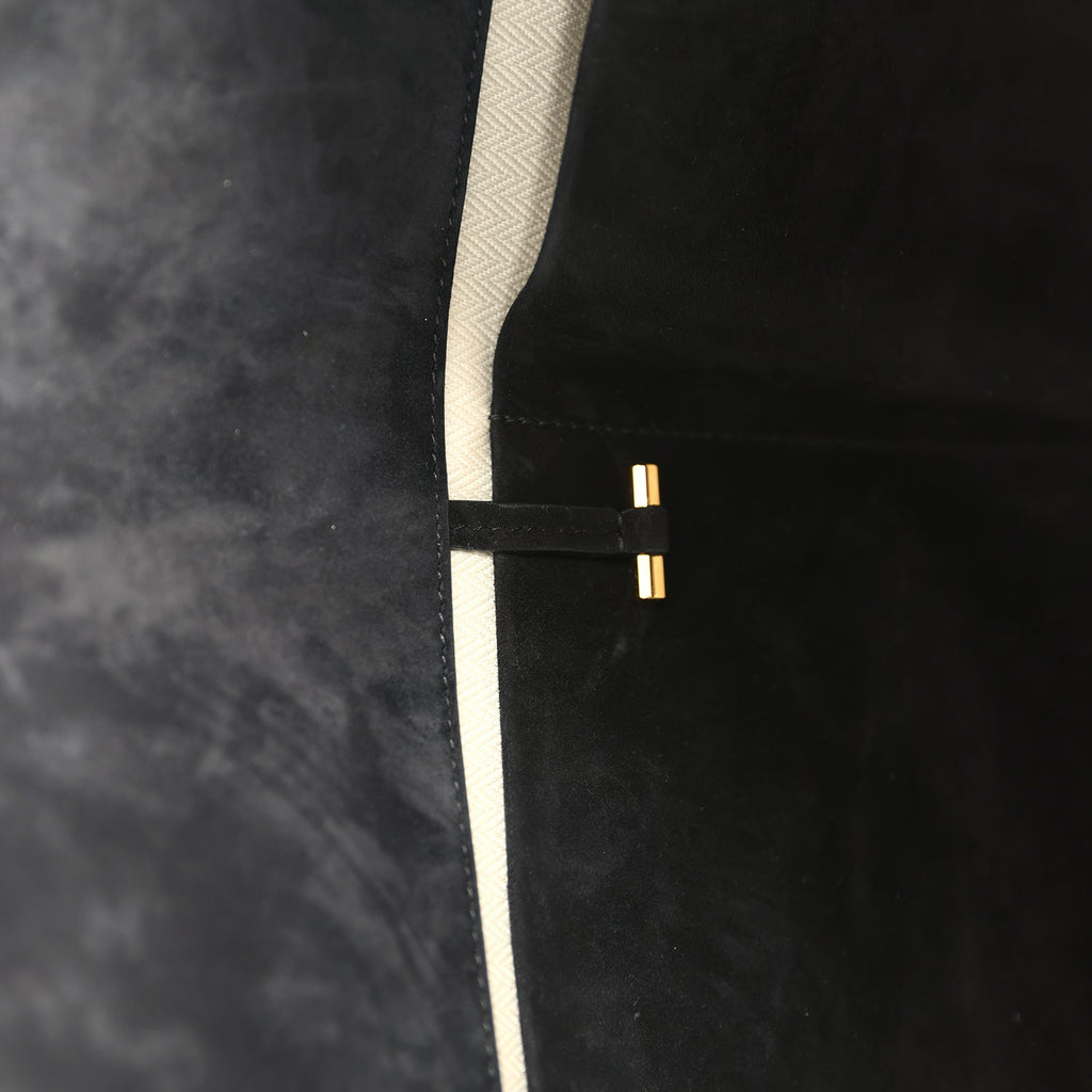 This Soft Margaux 15 Top Handle Bag is in black suede leather with gold hardware, featuring tonal stitching, double rolled handles, adjustable belted gusseted side panels and an interior toggle closure.The interior is lined in black suede leather and beige canvas and has two interior card slots and one interior zip pocket.Origin: ItalyCondition: New and never worn (plastic on hardware)Accompanied by: Dustbag, carebookMeasurements: 15″ x 11″ x 9″; Top Handles: 5.5″