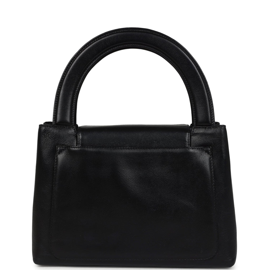 This vintage Chanel Large Top Handle Kelly is in black caviar leather with gold hardware, featuring tonal stitching, has a front tab with CC turnlock closure, back exterior pocket and two flat top handles.The interior is lined in black lambskin leather and has one zip pocket on the rear wall with logo pull, and one slit pocket.Collection: 5-series (1997-1999)Origin: ItalyCondition: Vintage; Excellent – This bag is slightly relaxed in shape around the bottom corners and base of bag. There is no plastic on the hardware. The front cc turnlock has no visible scratches. The exterior leather has noticeable creasing/wrinkling throughout to the leather. The top handles are a little floppy. The bottom base of the bag is slightly caved inward. There are no signs of scuffing or rubbing to the leather. The interior leather also has noticeable creasing throughout and a faint odor from age and storage. The date stamp sticker is legible and still intact.Accompanied by: MAC dustbag, COA CardMeasurements: 9.5” width x 6.5″ height x 2.7″ depth; 3.5″ top handle drop