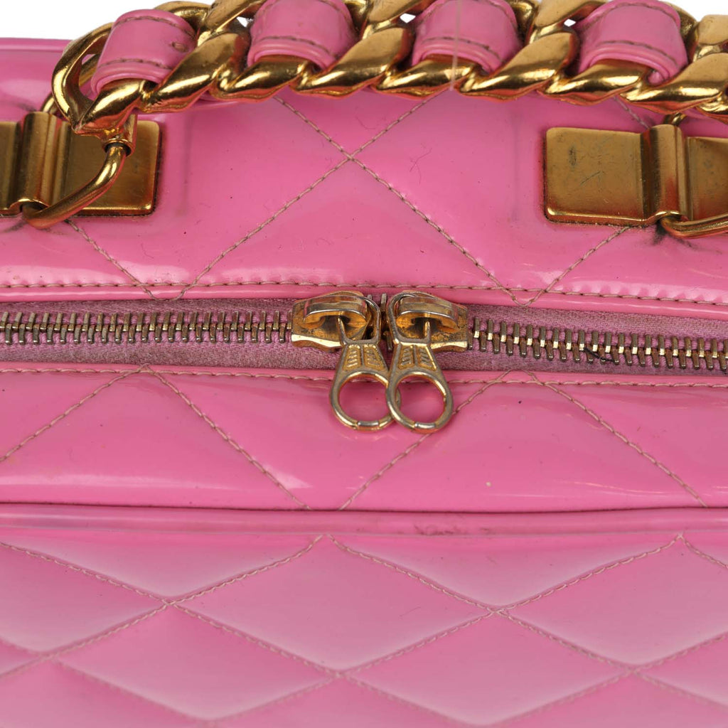 This vintage Vanity Case Bag is in pink quilted patent leather with gold hardware, a zip around closure, an interwoven leather and gold plated chain link top handle, and a detachable interwoven leather and gold plated chain link shoulder strap.The interior is lined with pink leather and has one zip pocket with a CC logo pull and an open slip pocket underneath on the back wall.Collection: 3-series (1994-1996)Origin: FranceCondition: Vintage; Very Good – This bag retains its shape. There’s no plastic on the hardware. Visible scratching and some minor tarnishing to the hardware. The exterior leather has wear throughout to the patent leather. The interior leather is clean but has some creasing and minor press markings.Accompanied by: Chanel dustbag, strap and COA cardMeasurements: 9.4″ width x 7.5″ height x 3.9″ depth; 2″ top handle; 24″ removable shoulder strap