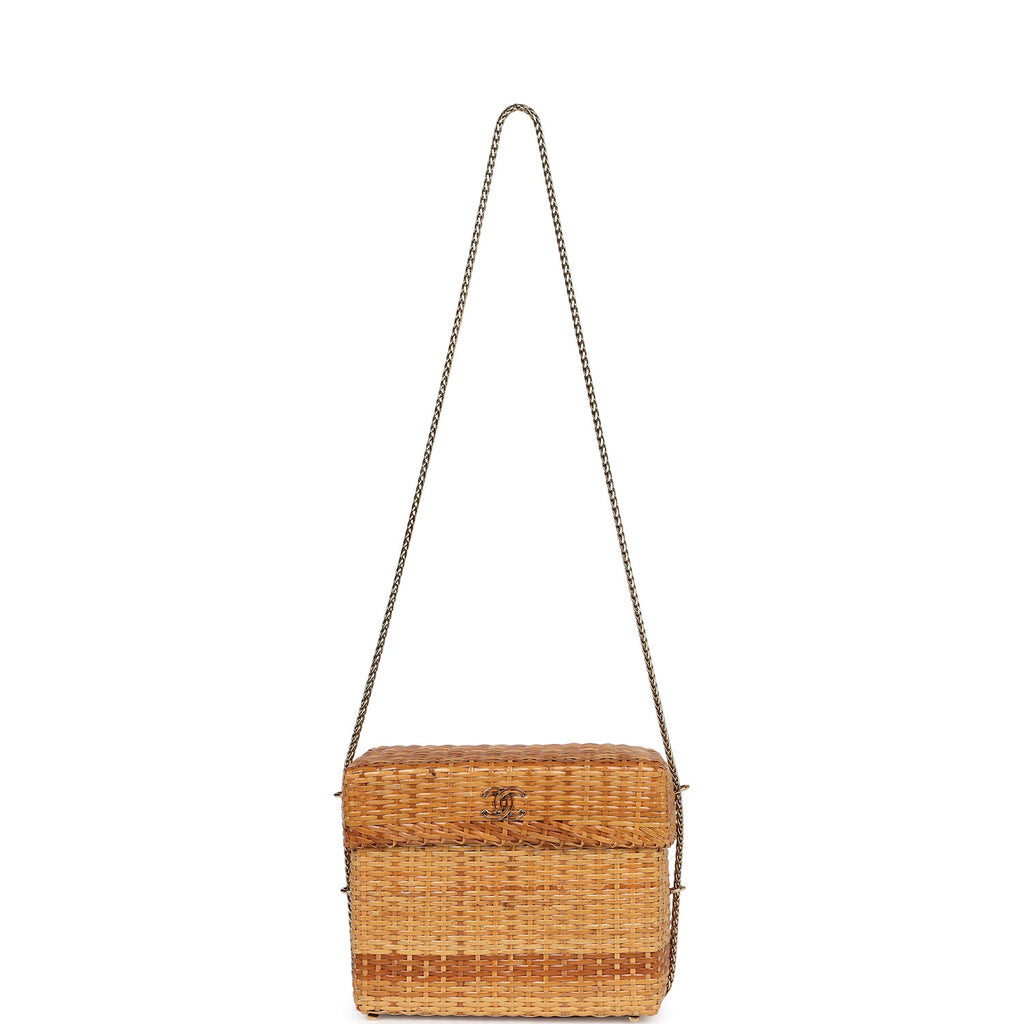 Vintage Chanel Small Picnic Basket Bag Natural Wicker Gold Hardware
