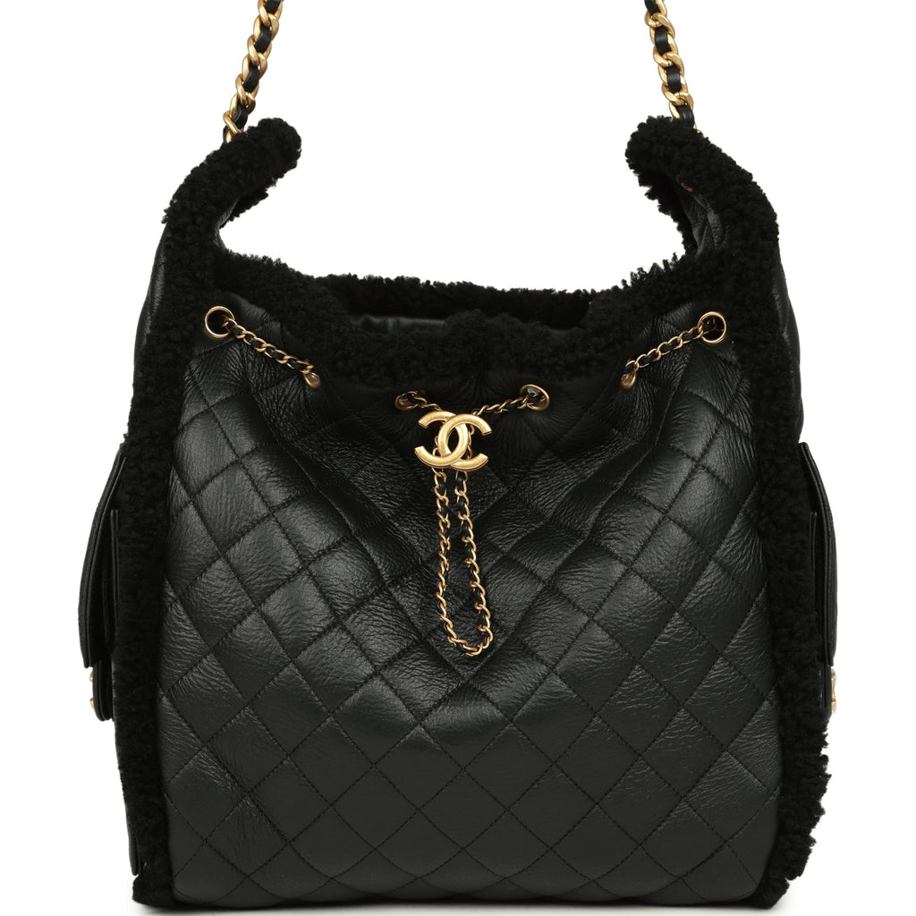 Chanel Medium 25 Hobo Bag Black Crumpled Sheepskin and Shearling Antique Gold Hardware